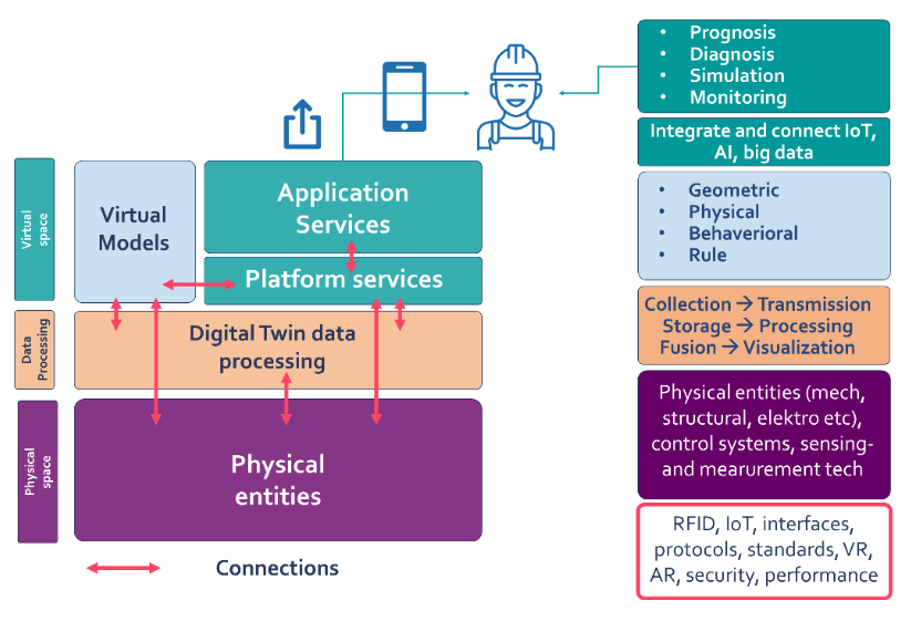 Een Digital Twin is een virtueel model van een fysiek systeem, bedrijfsmiddel of proces, waarbij het virtuele model en het fysieke systeem gedurende de gehele levenscyclus voortdurend gesynchroniseerd zijn, gebaseerd op een real-time uitwisseling van informatie (beide kanten op), zoals gegevens over prestaties, onderhoud en gezondheidsstatus).