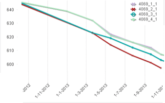 Onderstaande afbeelding geeft een voorbeeld weer van degeneratie van wielen over zowel tijd als gereden afstand.